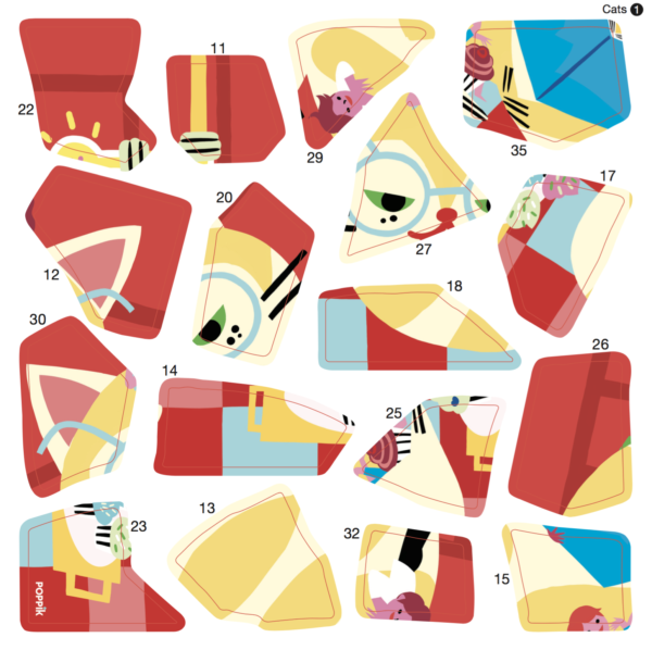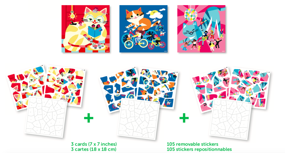 Gyere és lépj be TE is a francia Poppik márka kreatív és varázslatos világába, ahol játszva fejlesztheted gyermeked művészi érzékenységét, kreativitását, kognitív képességét, ahol a színek és formák elvarázsolják a kicsit és nagyot egyaránt. Jessica Das által illusztrált kártyák. Táncoló macska, olvasó macska, kerékpáros macska: ezek a matricás rejtvények a gyermeked kedvencei lesznek! A 3 illusztrált kártyára a számok követésével ragaszd rá a matricákat a fehér helyekre. Apránként kialakul a matrica-puzzle, és megjelenik a kép. Miután elkészült, keretezd be a kártyákat és díszítsd fel vele a szobád falát.