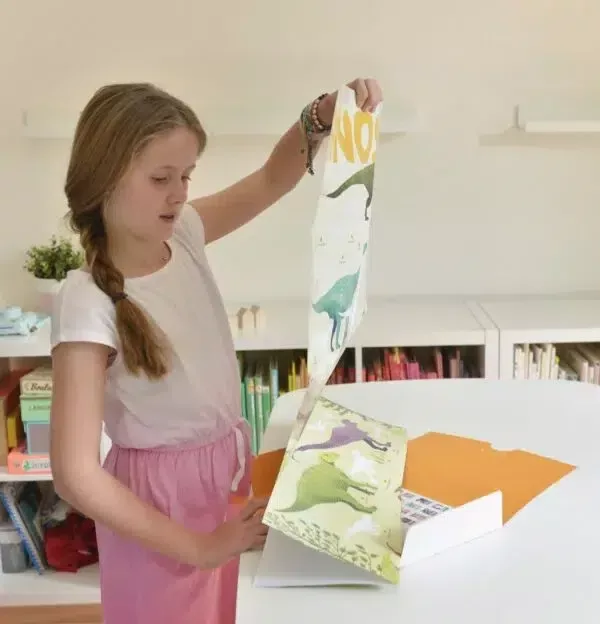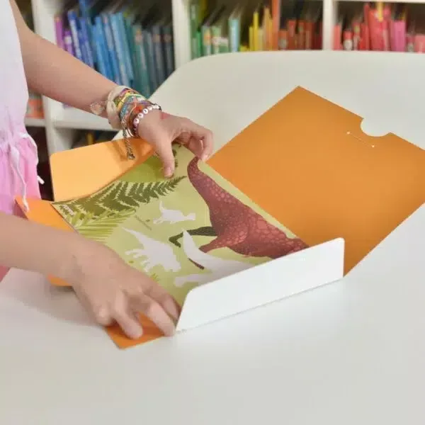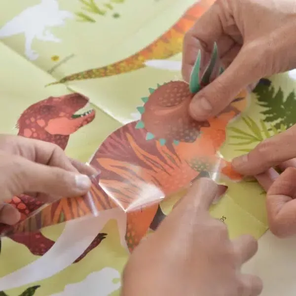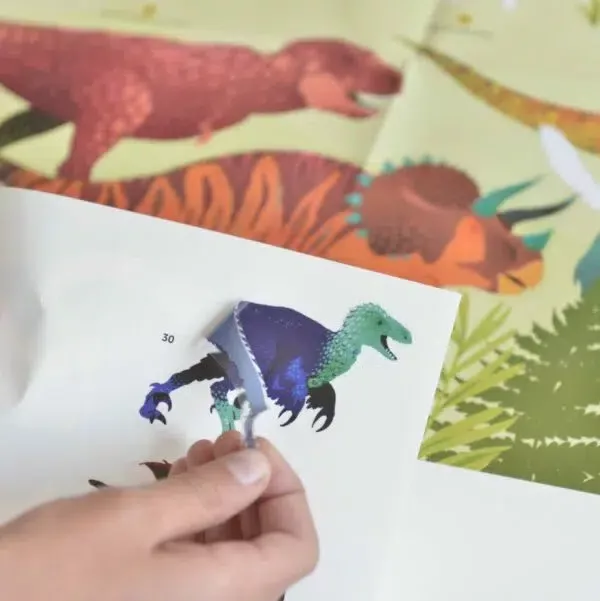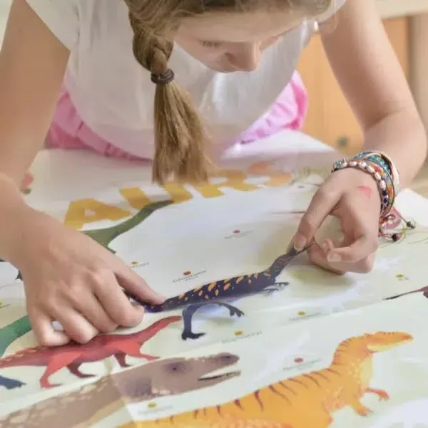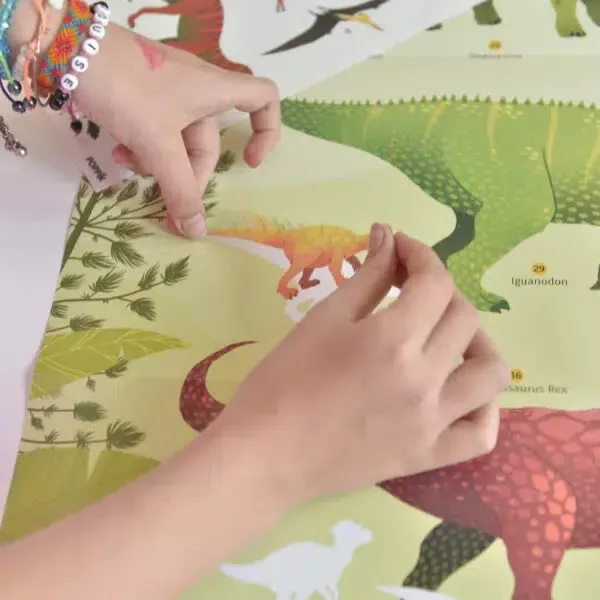 Ezzel a nagy poszterrel, áthelyezhető matricákon keresztül a gyerekek felfedezik a leghíresebb dinoszauruszfajokat. A nagyon szép matricák felragasztásához a gyermeknek meg kell figyelnie, össze kell hasonlítania, így fog könnyedén tanulni. A kékek, a vörösek és a zöldek árnyalatában ez a poszter tökéletesen illeszkedik minden típusú gyermekszoba díszítéséhez. Gyönyörűen díszít majd egy nappali vagy egy családi szobát is.