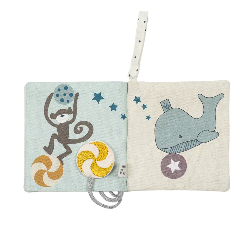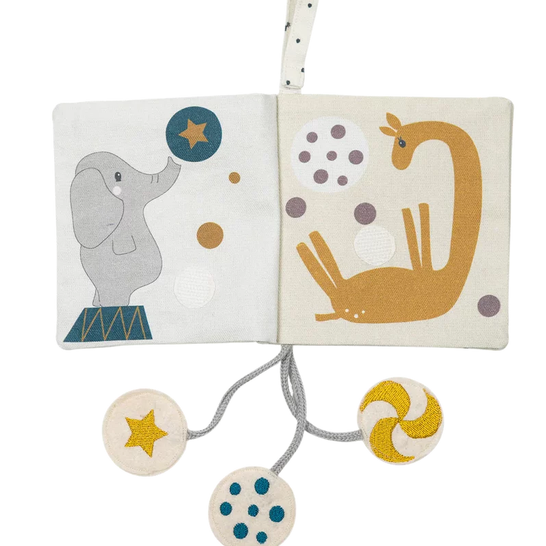 Gyönyörű kiskönyv édes nyomatokkal. Zörgős oldalak. A könyvben található kis korongok tépőzárral lazíthatók és rögzíthetők. Csak helyezd vissza őket a megfelelő helyre. Meg tudod csinálni? Könnyen rögzíthető a babakocsihoz vagy az autóüléshez. Végtelen órányi szórakozást kínál, és egyben serkenti a finommotorikai készséget és a tapintást. Mérete 12×12 cm. Kézzel, 100%-ban biopamut, Öko-tex anyagokból készült, GOTS minősítéssel. Ultrapuha, társadalmilag és környezetbarát módon,  holland dizájnnal.